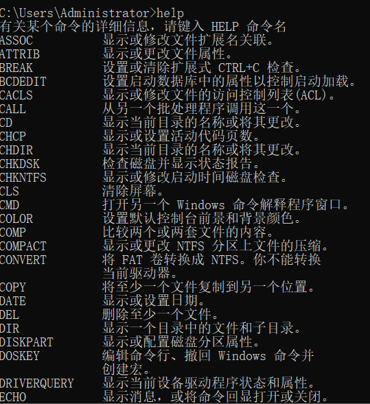 首先在cmd命令输入help,看到如下图的结果,这里是原生的cmd
