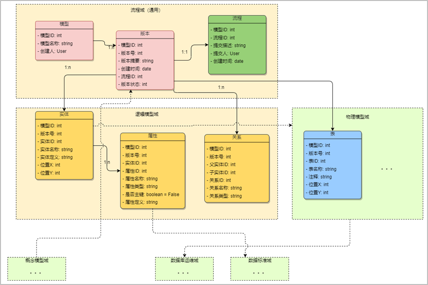 合理规划业务对象的关系、继承,实体包含属性、表包含字段、表包含索引、关系关联两个实体、ER图包含实体、关系等。确定聚合关系,实体头信息和属性列表构成实体、表头信息和字段列表+索引列表构成表、版本状态与流程构成版本化。接下来需要确定值对象,如字段类型、索引类型、操作动作类型等,最后领域模型验证需求,通过以上的流程我们实现了一个领域模型,如下图: