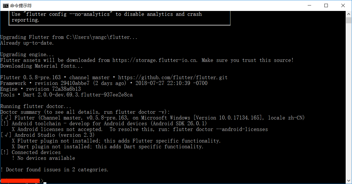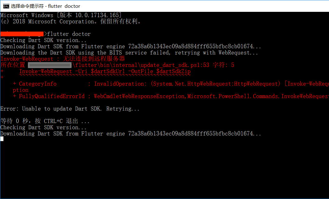 cmd 中运行 Flutter:flutter doctor,但是不幸报错,提示无法连接远程服务器,如图:
