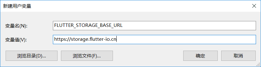 第 3 步如果是有梯子的情况下正常,但小菜没有梯子,所以忽略了进门第一件重要的事,配置国内环境,在环境变量中添加用户 Path 变量:PUB_HOSTED_URL -> https://pub.flutter-io.cn 和 FLUTTER_STORAGE_BASE_URL -> https://storage.flutter-io.cn,强烈建议优先配置这一步,会省去很多不必要的麻烦,小菜仅从自己遇到的问题顺序整理,如图;