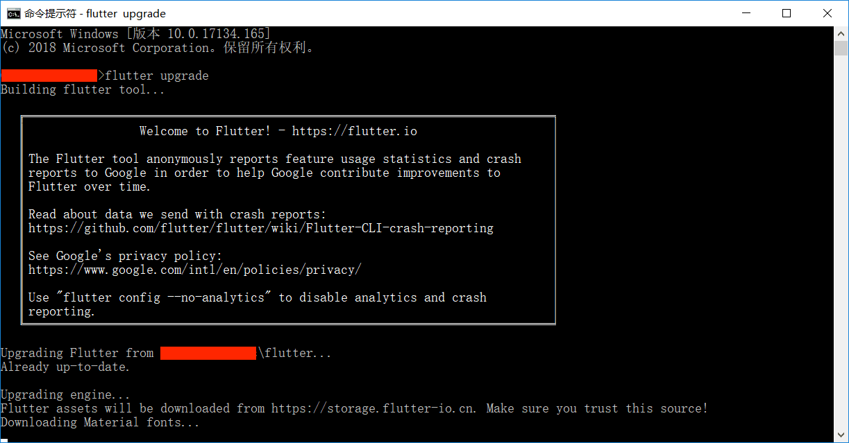 重新打开 cmd -> flutter upgrade,之后等待进行,即可顺利安装: