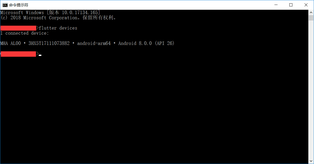 电脑连接手机,打开开发者模式,打开 cmd -> flutter devices,检测是否连接设备,如图: