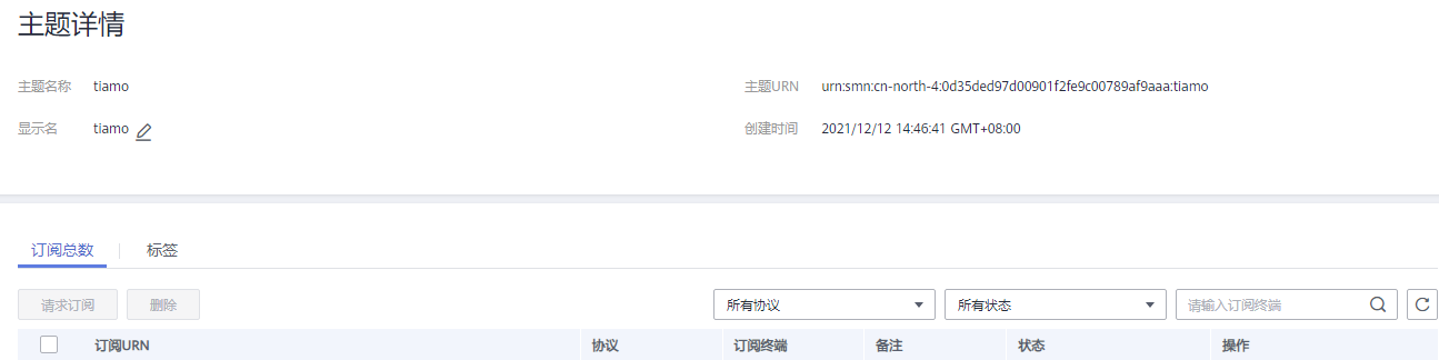 主题创建成功后,系统会自动生成主题URN,主题URN是主题的唯一资源标识,不可修改。新创建的主题将显示在主题列表中。