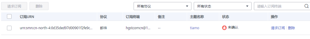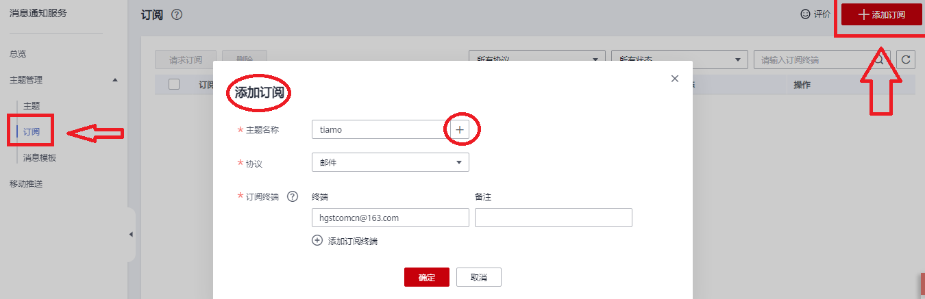 - 进入“消息通知服务控制台”页面选择“主题管理” 点击 “订阅”,进入“订阅”页面。