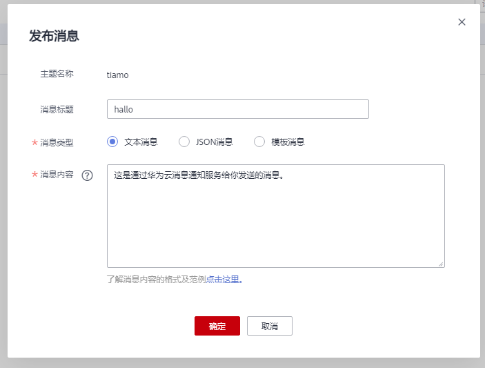 - 在弹出的发布消息对话框中,主题名称为已选择的需要发布消息的主题名称,不可修改。
