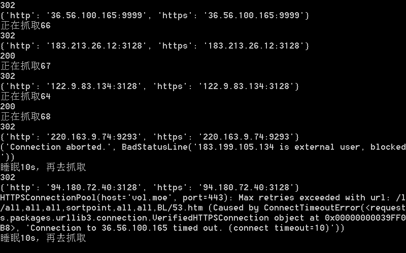 下述代码通过判断目标网站返回状态码是否为 200,如果为 302,更换代理 IP,再次爬取。