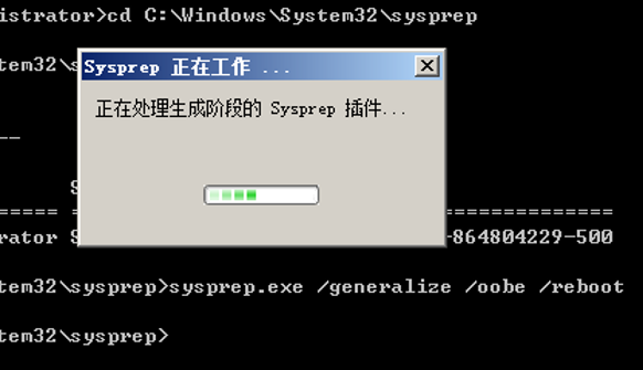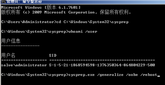 4、执行修改SID的命令,完整过程如下,最后电脑自动重启,开始初始化一个新的SID。