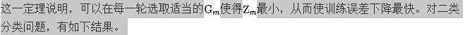 这表明在此条件下AdaBoost的训练误差是以指数速率下降的。这一性质当然是很有吸引力的。
