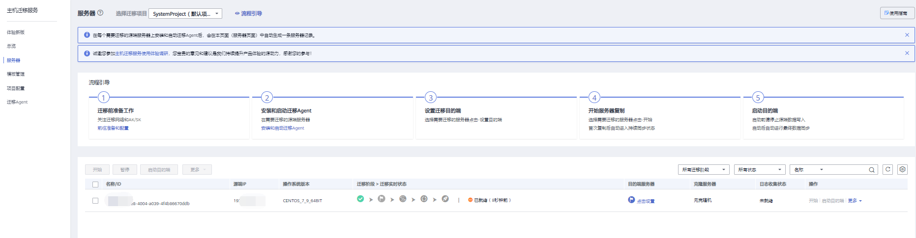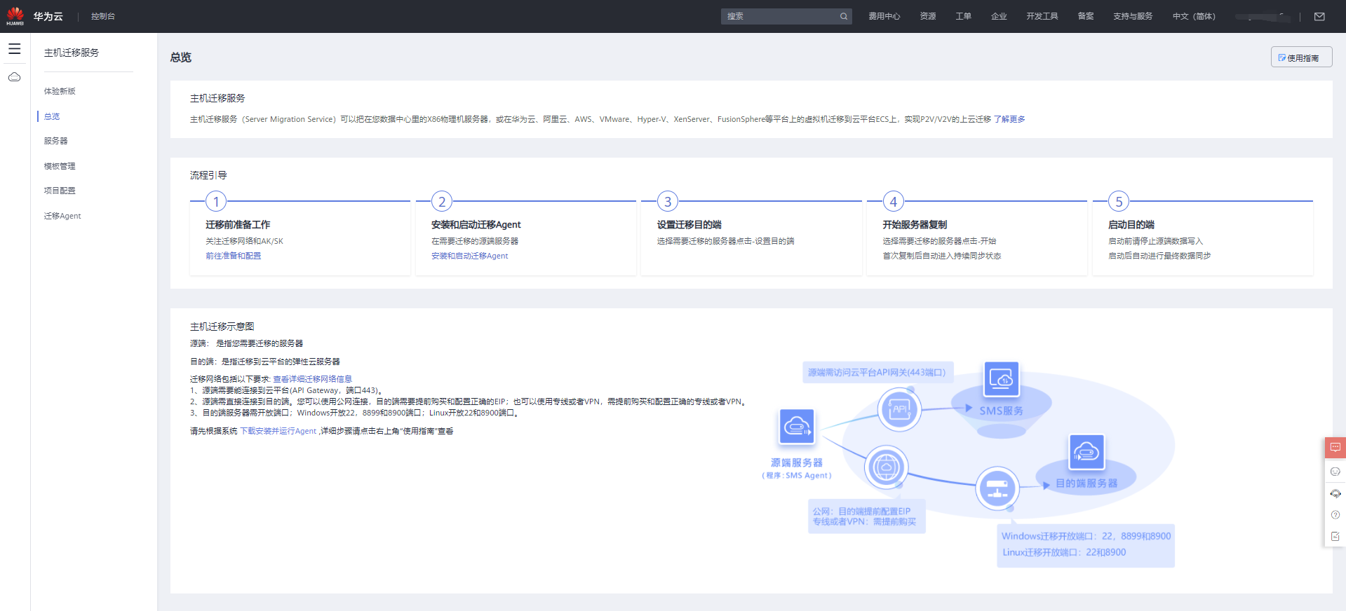 在总览页面可以看到有关迁移的流程引导:从迁移前准备-->安装和启动迁移Agent-->设置迁移目的端-->开始服务器复制-->启动目的端