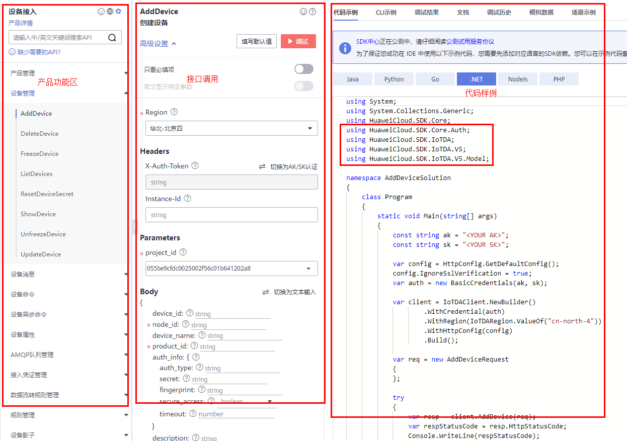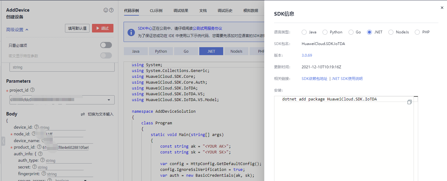 而今天,在Api基础上,华为IoT应用测提供了在线的Api Explorer,非常强大的Api实时测试,并且给出了各种语言的代码样例。再加上HuaweiCloud.SDK家族完善,IoT上就用到了HuaweiCloud.SDK.IoTDA这个包。