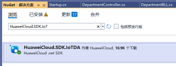 以.Net为例,通过VS 2022的nuget可以轻松引入。在解决方案上右键菜单,选项nuget包管理。在随后的浏览框中输入HuaweiCloud.SDK.IoTDA。选择目标并安装。