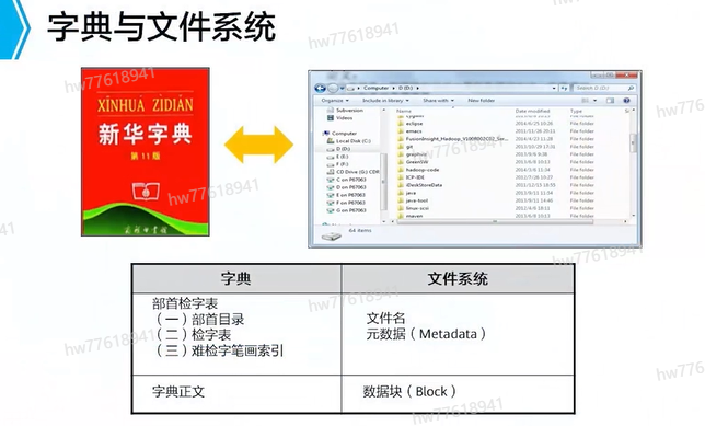 首先我们理解一下文件系统的含义。为了方便大家理解,我们把新华字典与文件系统进行了类比,其中新华字典中有目录、检字表,还有难检字的索引,对应的就是文件系统的文件名以及元数据(Metadata)。新华字典的字典正文就是对于文件系统的数据块,文件系统它主要是为了方便文件的查找以及管理,接下来我们对HDFS进行概述。