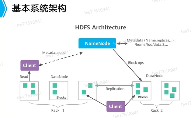 HDFS的基本的系统架构我们从这个图中可以看到,它主要包括客户端、NameNode和DataNode。对于客户端,它主要包含了HDFS的一些接口,它用来访问HDFS上的文件。对于NameNode,它存储的是文件名以及元数据,还有就是文件与数据块的对应关系。对于DataNode,它是用来存储数据的节点。我们在HDFS的系统中可以有多个client、多个data node,但是对于提供服务,name node只能有一个。接下来我们介绍HDFS文件的基本存储单位block块,一个文件可以分成很多块,默认的一个块的大小是128M,我们以块为存储单位,大数据HDFS文件系统的块的大小远远大于普通的文件系统,可以起到最小化寻址开销的作用,提高了读取的吞吐量。