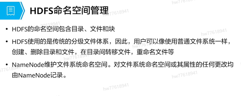 接下来我们看看HDFS命名空间管理。HDFS的命名空间它包含目录、文件和块。HDFS使用的是传统的分析文件体系,我们以前的方式是直接用斜杠,我们就可以来访问到相应的文件。用户可以像使用普通文件系统一样可以很方便的对文件进行创建、删除以及重命名文件。HDFS采用name node维护文件系统的名称,对文件系统的名称空间、过期属性的任何更改都有namenode的记录。有两种的数据结构,一个fsimage,一个是EditLog,主要是用来记录客户端对原文件的修改。