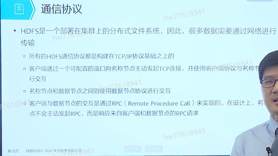 接下来我们介绍HDFS通讯协议,HDFS通信协议主要都是基于tcp/ip协议的。客户端通过一个可配置的端口向名称节点主动发起TCP连接,并使用客户端协议与名称节点进行交互。名称节点和数据节点之间则使用数据节点协议进行交互,客户端与数据节点的交互是通过RPC ( Remote Procedure Call)来实现的。在设计上,名称节点不会主动发起RPc,而是响应来自客户端和数据节点的RPC请求。