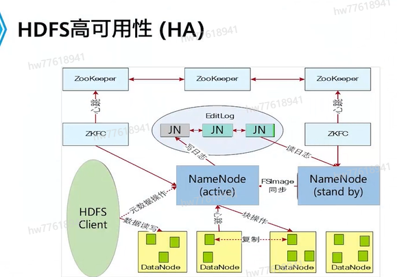 首先我们来看HDFS的高可用性。高可用性它的缩写是HA(Highly Available)。高可用性是Hadoop2.0发展出来了一个新特性,因为对于Hadoop1.0来说,它只有一个名称节点,如果这个名称节点一旦崩溃了,整个集群将处于不可用。我们说HDFS1.0即使一个名称节点不可用之后,我们可以采用手工的方式,把集群先停下,然后把相应的备份文件,比如说fsimage和EditLog拷贝到namenode上,我们重新启动,但是它会停用一段时间。在2.0中,我们对这个问题进行了改进。设计了两个名称节点,一个称为了active NameNode,一个称为stand NameNode。一般我们称active NameNode它是主节点,stand NameNode称为二备份节点。通常情况下在集群运行的某个时刻,只有一个主节点提供服务。这个备用节点它是用来备份元数据信息的。我们为了去保证在集群中始终有一个提供服务的主名称节点。因此我们需要采用Zookeeper监控名称节点的心跳。当发现这个主名称节点崩溃的时候呢,就会来起用这个备用名称节点。备用名称这里它需要去存储相应的原数据信息。