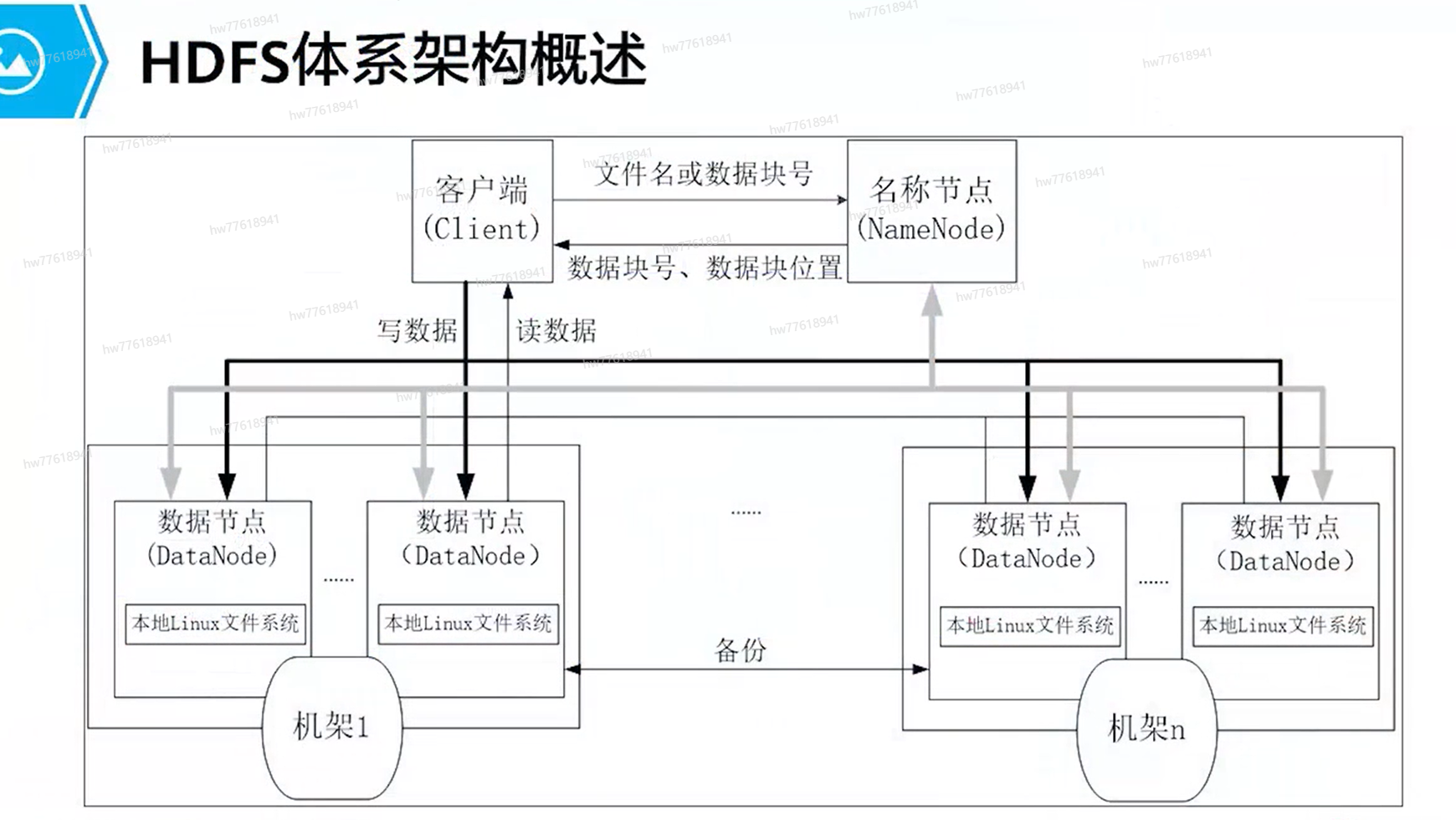 hdfs包含名称节点、数据节点,在hdfs的分布式文件系统中,名称节点只有一个,数据节点可以有多个。除此之外还有客户端,客户端包含了hdfs的一些api,我们利用客户端可以去给名称节点发送文件名或者是数据块号查询他想去查询的数据块,名称节点中它记录了数据块存储在哪些数据节点之上,然后就通知相应的数据节点,让客户端从数据节点上读取数据,也就是读取这些数据。这就是个HDFS体系结构。