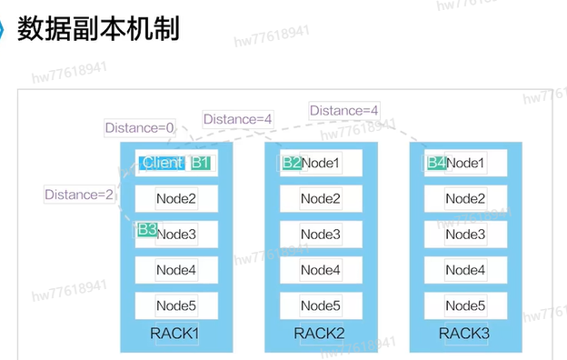 假如说我们的客户端提交了要存储一个数据块,那么这个数据块它是怎么存放的啊?如果说客户端在某个机架上的某个机器的服务器上,这时候它就会在所相应的这个服务器节点上去存储一个数据块block。如果说我们这个客户端不在这个机架上,在集群的外部,那我们就会在某个资源最丰富(存储资源)机架寻找一个节点,把相应的数据块存到这个节点上。然后它的第二个块是怎么样去存储的?他会来找其他的一个机架的很多个服务器,就会相应的在上面去找一个数据节点,然后把数据块传出来这个数据节点上。对于第三个副本我们一般情况下就会找到跟第一个副本所在的同一个机架,然后把第三个副本放到另外一个block上。如果说还有多的副本,因为我们这个副本是可以去设置的,我们通常情况下对伪分布式的模式只有一个副本。对于这种真实的集群环境下,我们可以设两个、三个、四个,当然也不是越多越好。根据实际情况,我们一般默认是三个副本,如果说有多余三个副本,他就会来去随机的去可以算出一个值,然后让你存随机存储到某一个节点上。