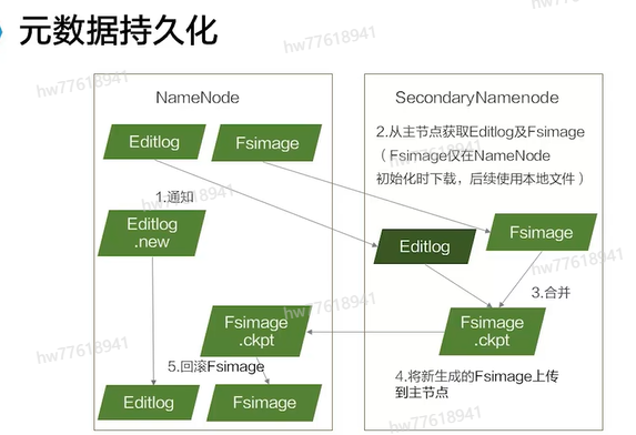 NameNode 基于内存存储文件元数据、目录结构、文件 block 的映射等信息,为了保障其可靠性,需要对其进行持久化。日志文件的方式 和 内存 Dump 都有其相应的优势与劣势,因此 HDFS 也使用了混合的方式。HDFS 同样也同时使用了这两种方式,其 日志记录 方式被称为 EditsLog,其内存 Dump 方式被称为 FsImage。因为 EditsLog 和 FsImage 也存在 日志记录 和 内存 Dump 的固有的缺点,因此两种方式都使用,来弥补对方的缺点。