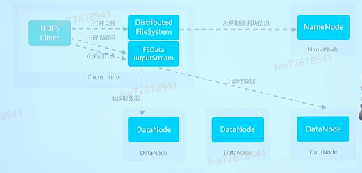 首先我们发送一个打开文件的请求,接下来我们要从上去获取打开文件Distributed FileSystem的元数据信息,就是说需要在DataNode上去获取它所需要的这个block。好,再就是读取请求是通过FSData IuputStream进行封装,紧接着就会找到相应的来DataNode去读取它所需要的block,block最后关闭枢纽,关闭了文件系统。