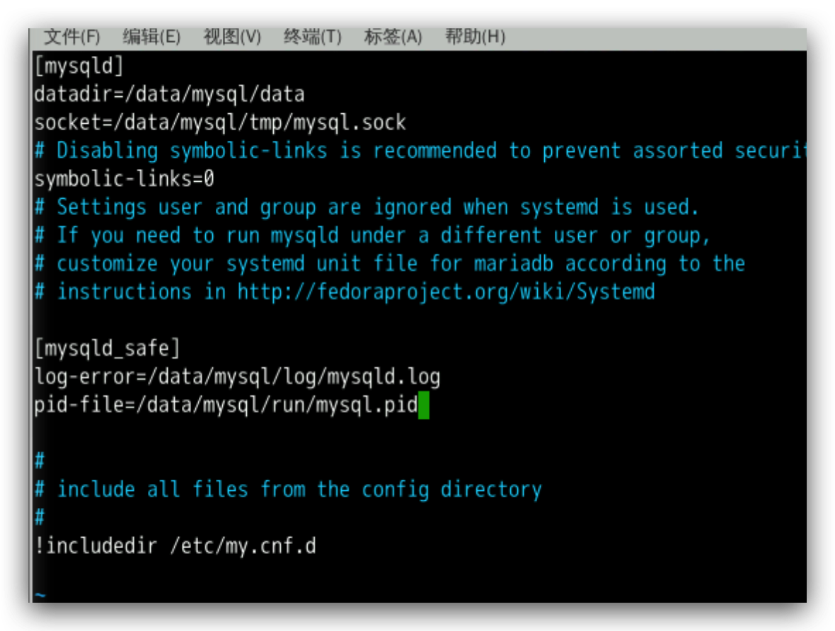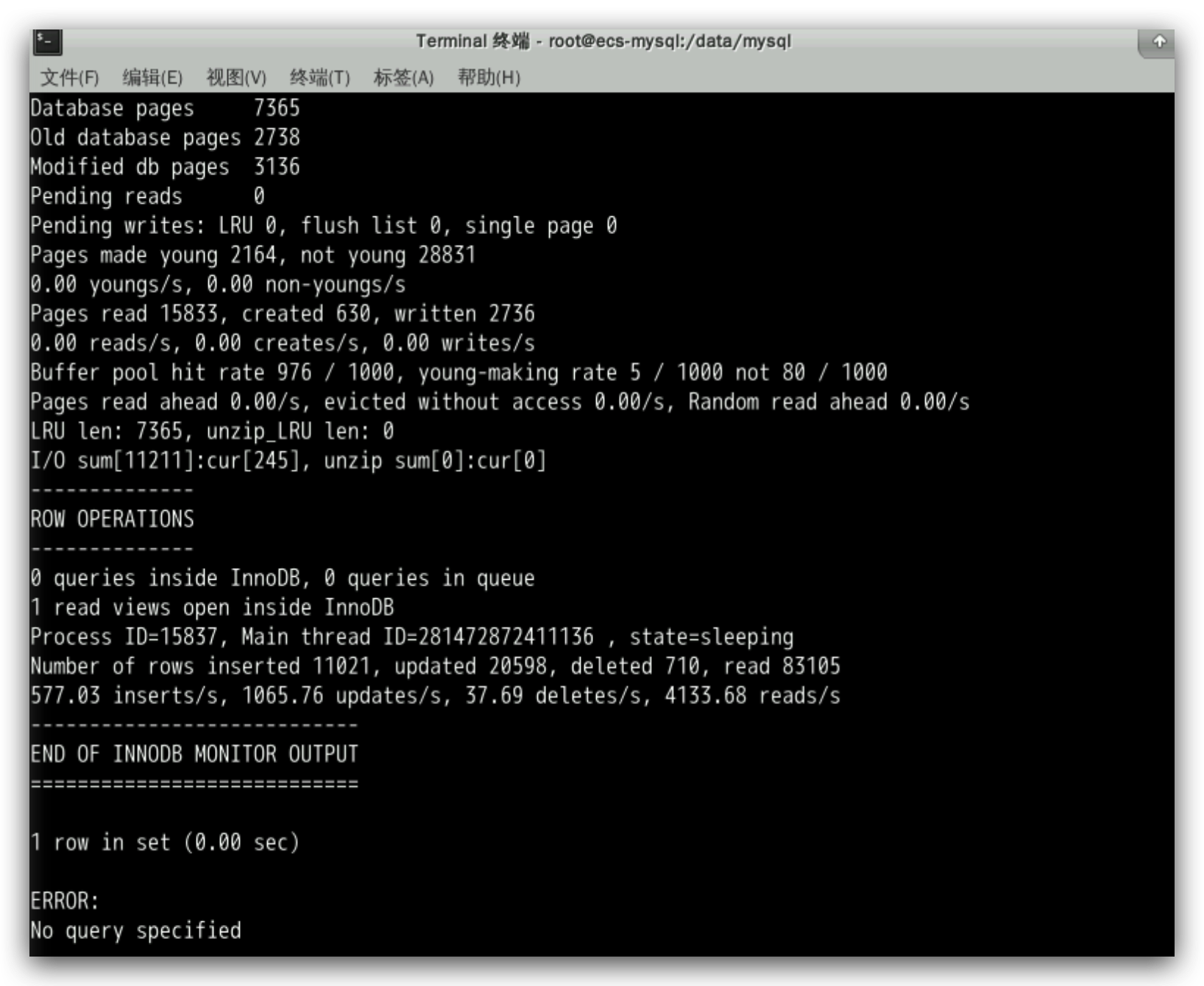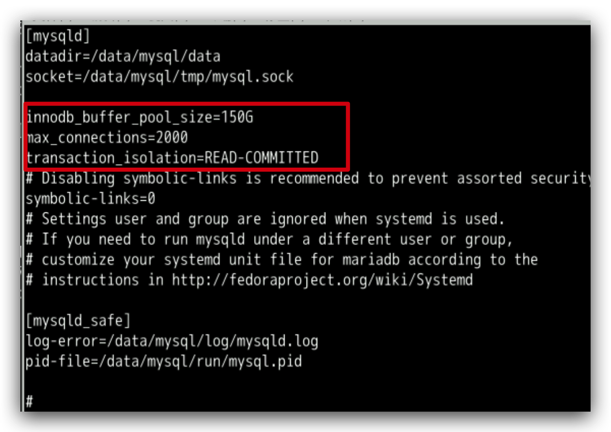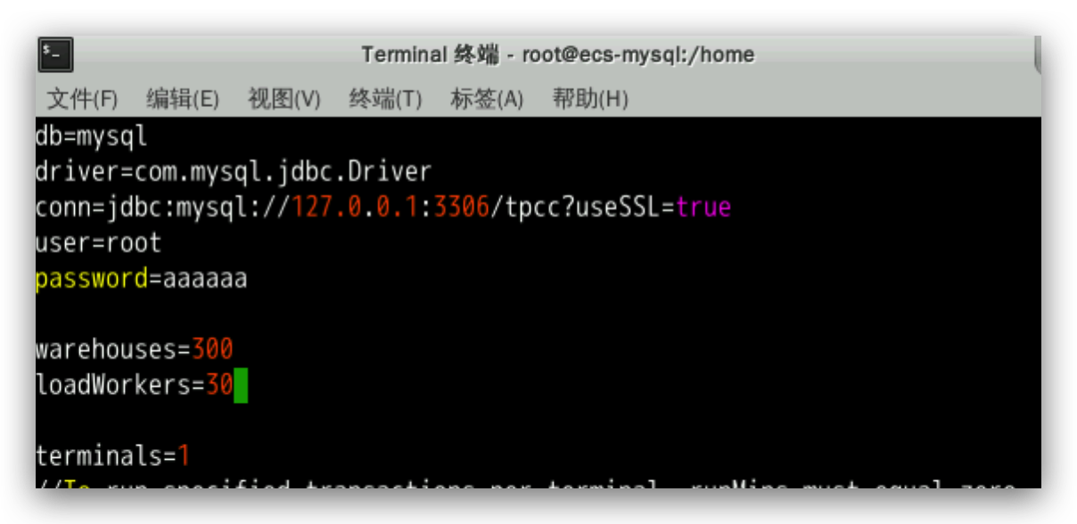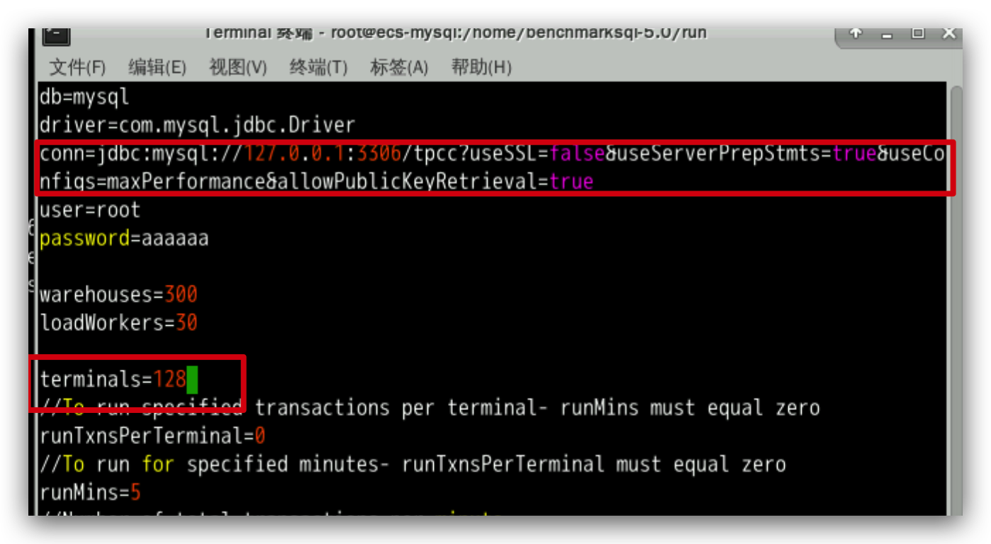 数据库配置文件调优在Terminal窗口二执行以下命令,打开数据库配置文件,修改配置参数: