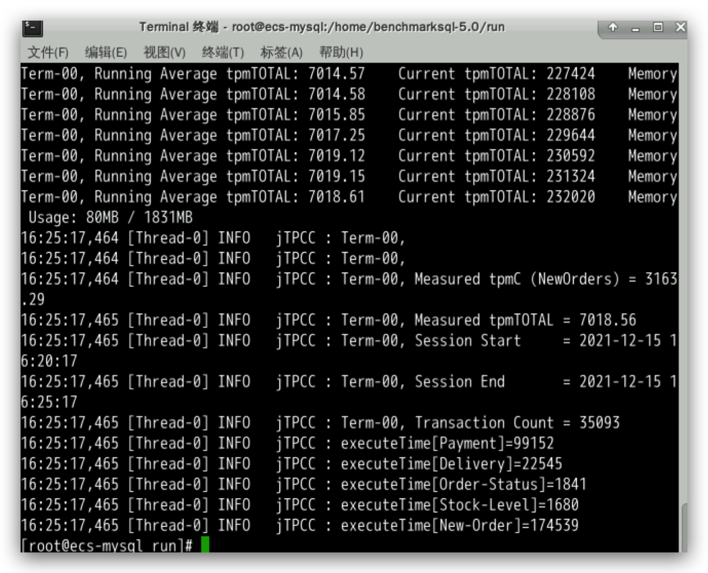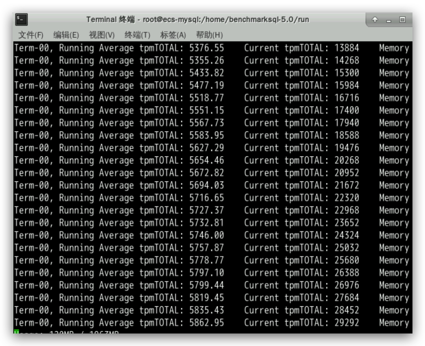 经过与调优前的运行结果对比,可以看到tpmC值有了较大幅度增长,验证了MySQL服务机的性能得到提升。