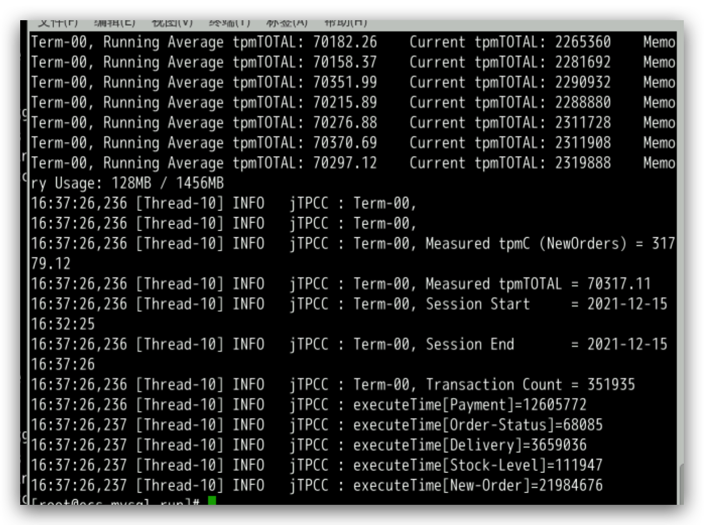 继续执行以下命令,进行tpcc模型测试【需等待约4分钟】: