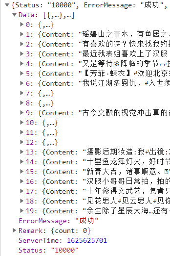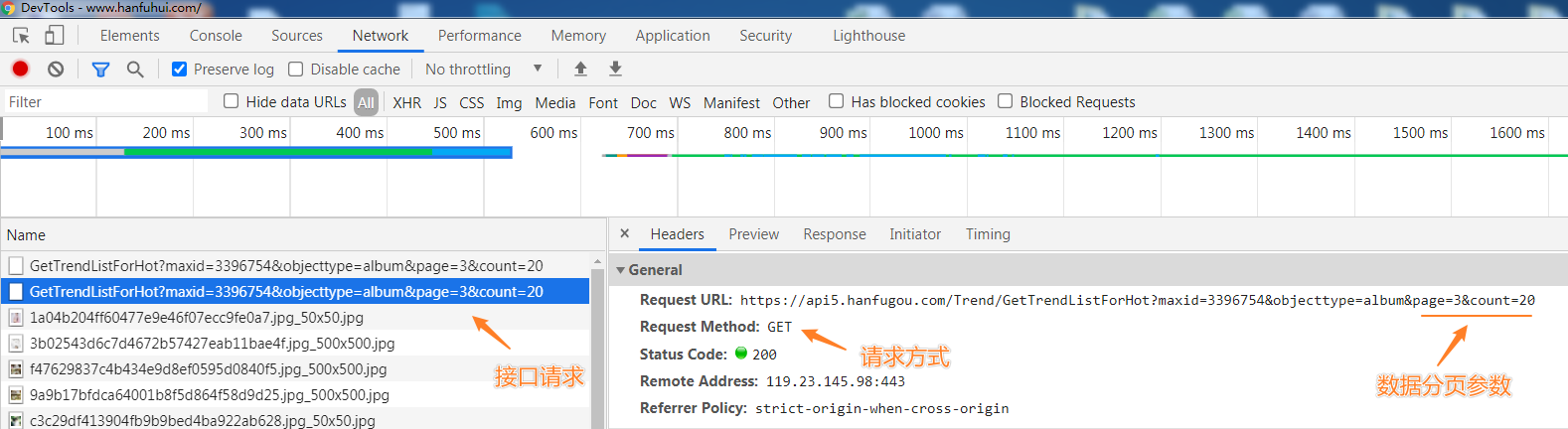 https://api5.hanfugou.com/Trend/GetTrendListForHot?maxid=3396754&objecttype=album&page=3&count=20,其中重要的参数为page与count,即页码与每页数据量,测试过程发现,count值可以任意修改,当超过100之后,接口返回数据速度变慢,后续该值设置为500。 -