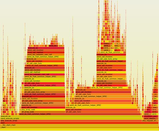 这种结果的输出还是不直观的,Linux性能优化大师Brendan Gregg发明了火焰图(因整个图形看起来像燃烧的火焰而得名),以全局的方式来看各个函数的调用时间分布,以图形化的方式列出调用栈。