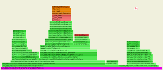 对比两张火焰图,使用74时ClientHandshaker.processMessage占比为1.15%,而在202中这个函数占比为23.98%,很明显在ClientHandshaker.processMessage带来了性能差异。