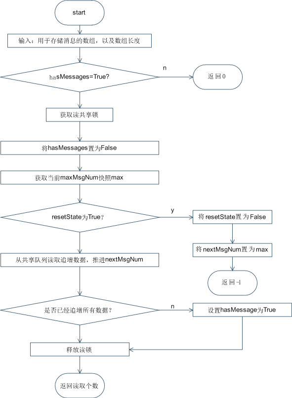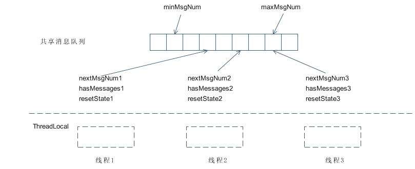 NOTE:在读取共享消息队列过程中,每个线程推进自己的nextMsgNum位置,以方便记录数据追增情况。