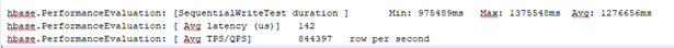另外为了验证,使用一个额外的客户端机器,通过HBase自带的PerformanceEvaluation工具(简称PE)来验证HBase读、写性能。PE支持随机的读、写、扫描,顺序读、写、扫描等。