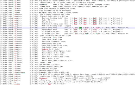 对于JDK8和JDK11同时配置日志收集功能,重新测试,获得GC日志。通过GC日志分析,我们发现差异主要在G1 young gc的object copy阶段(耗时基本在这),JDK11的Young GC耗时大概200ms,JDK8Young GC耗时大概100ms,两者设置的目标停顿时间都是100ms。