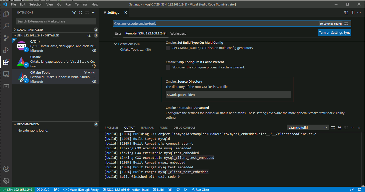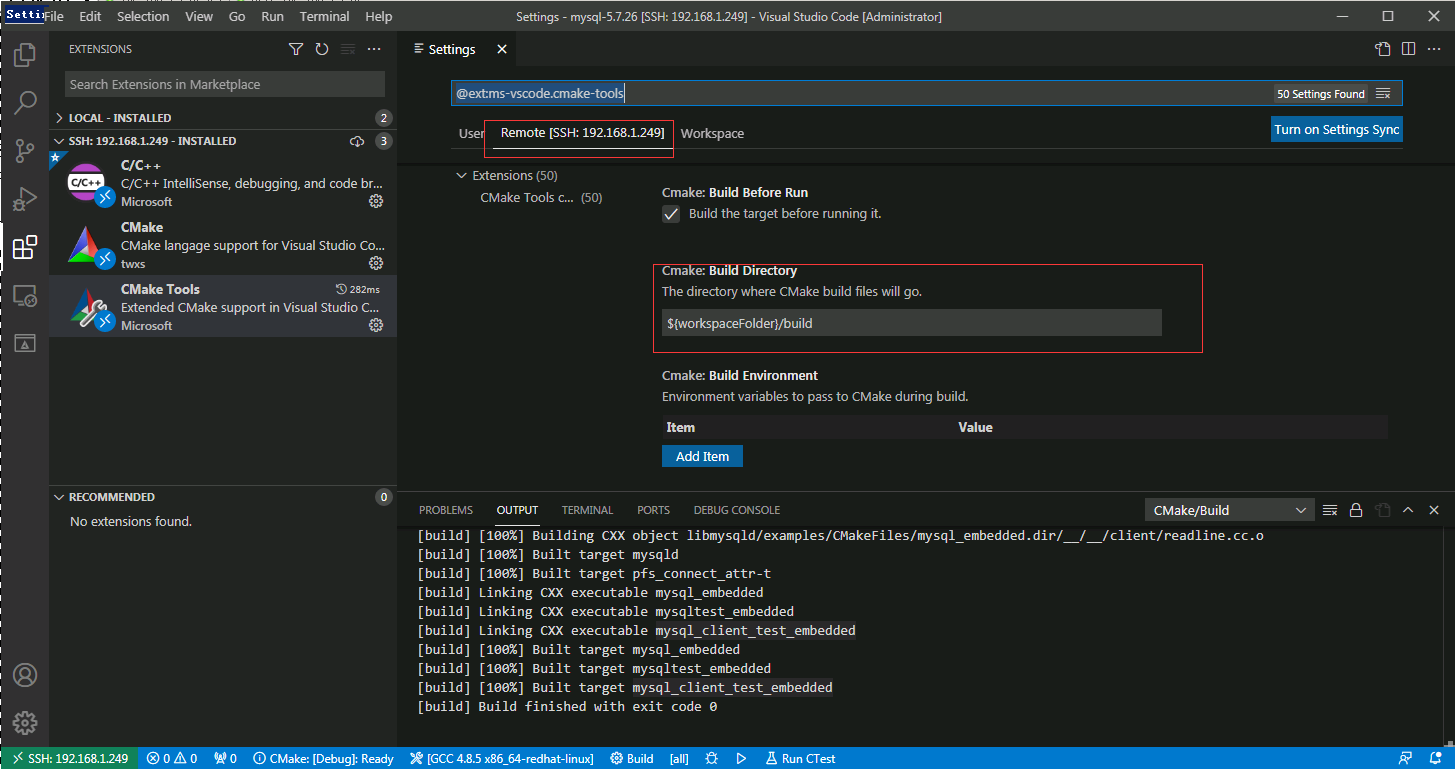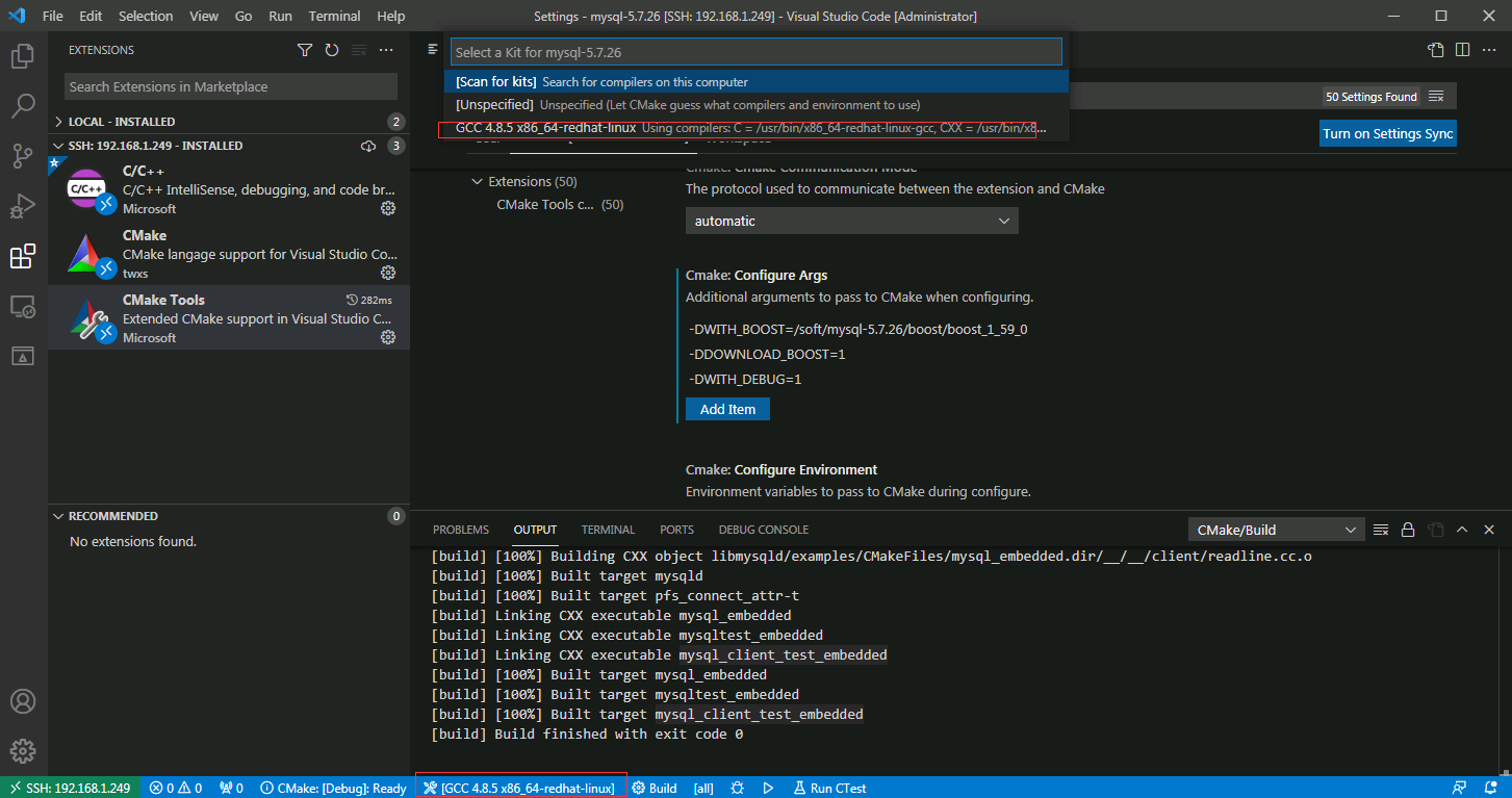这里选择Remote [SSH:192.168.1.249],我这对于Build Directory选择使用默认配置,因为${workspaceFolder}就是/soft/mysql-5.7.26目录,所以$${workspaceFolder}/build也就是/soft/mysql-5.7.26/build目录
