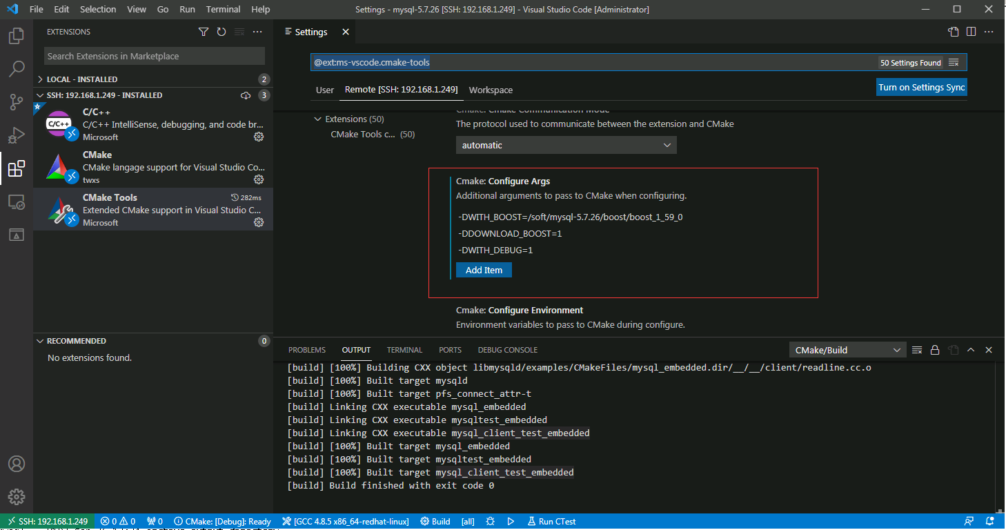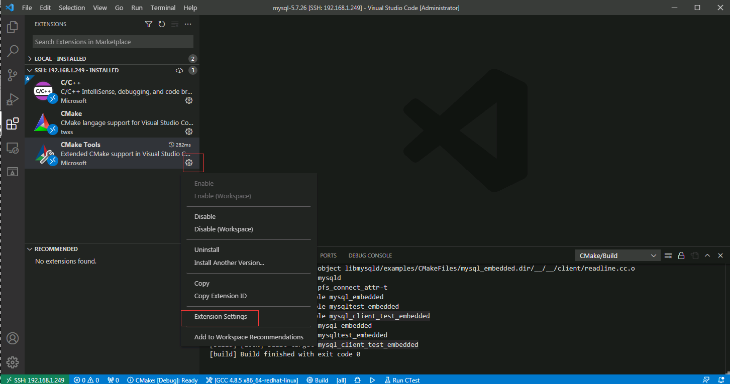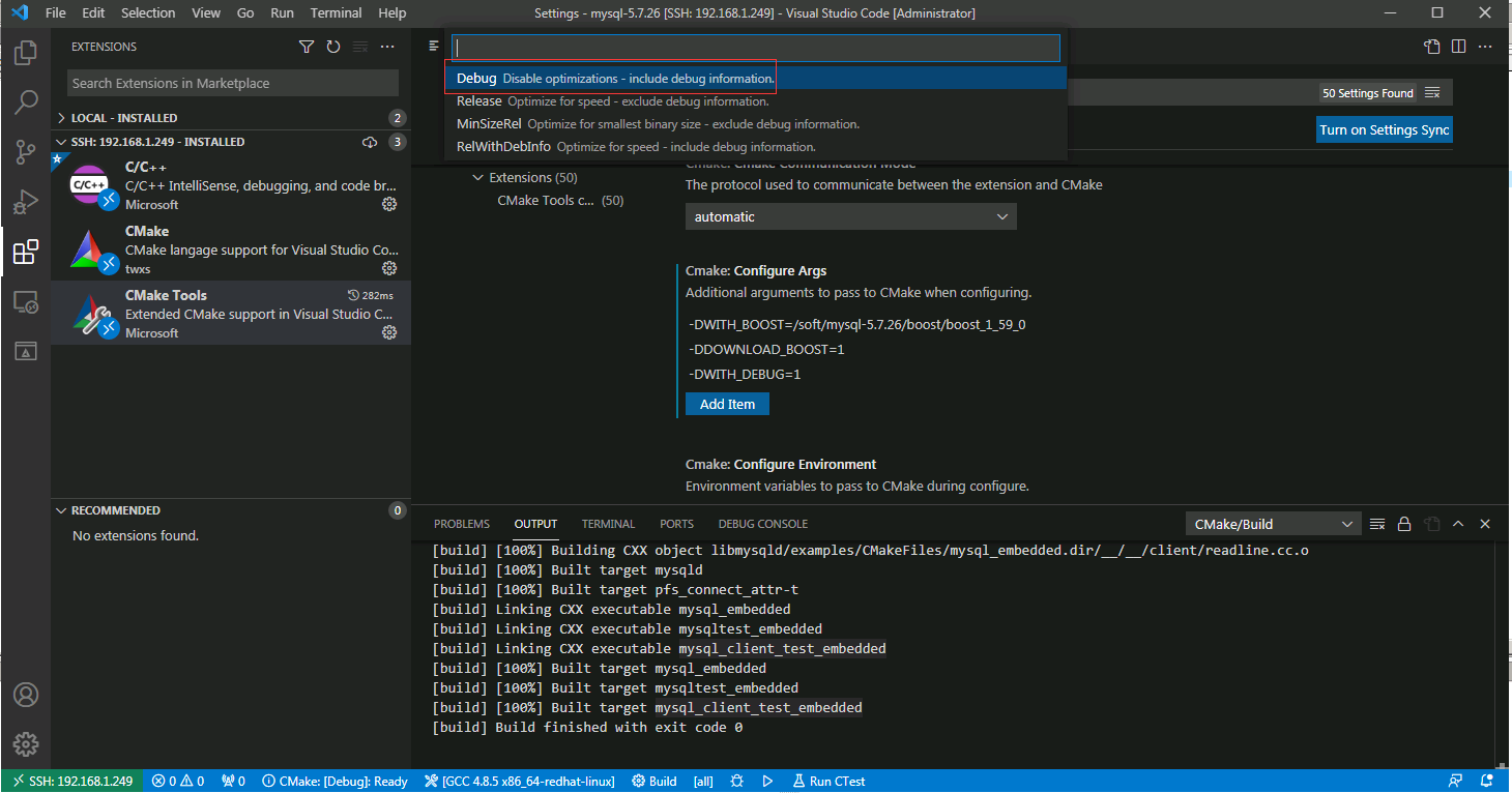 这里选择Remote [SSH:192.168.1.249],我这对于Build Directory选择使用默认配置,因为${workspaceFolder}就是/soft/mysql-5.7.26目录,所以$${workspaceFolder}/build也就是/soft/mysql-5.7.26/build目录