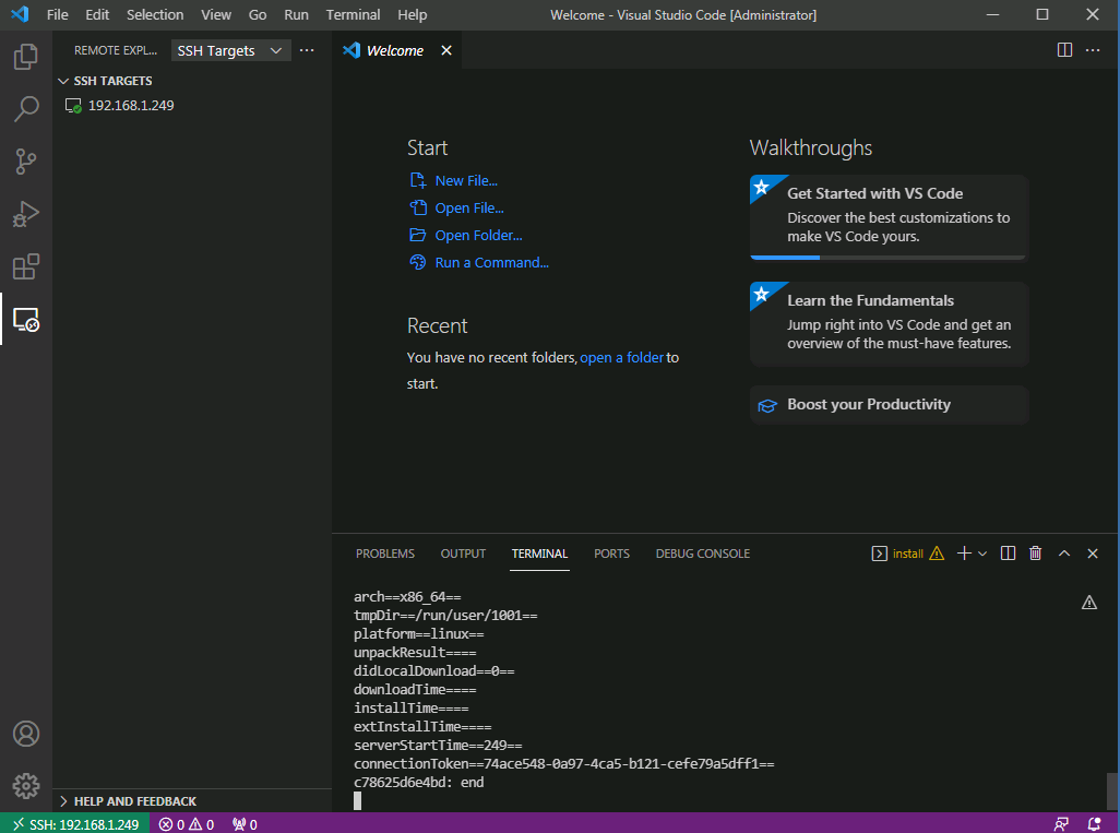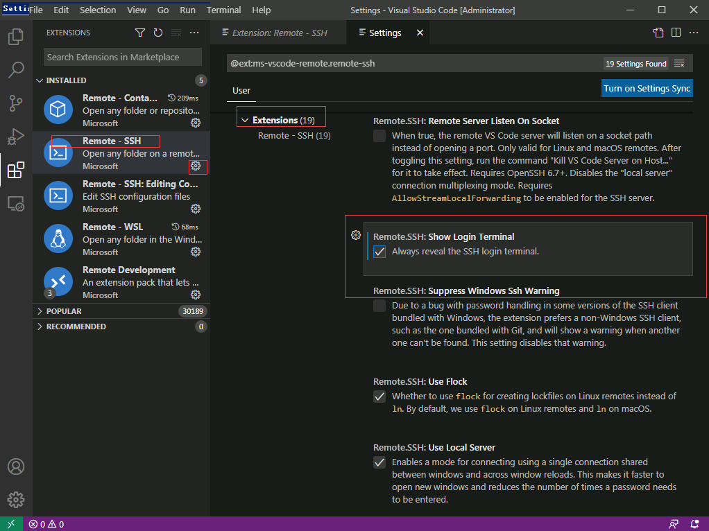首先改设置, 左下角 管理(⚙) -> 设置, 搜 “remote.SSH”, 勾选 remote.SSH.showLoginTerminal