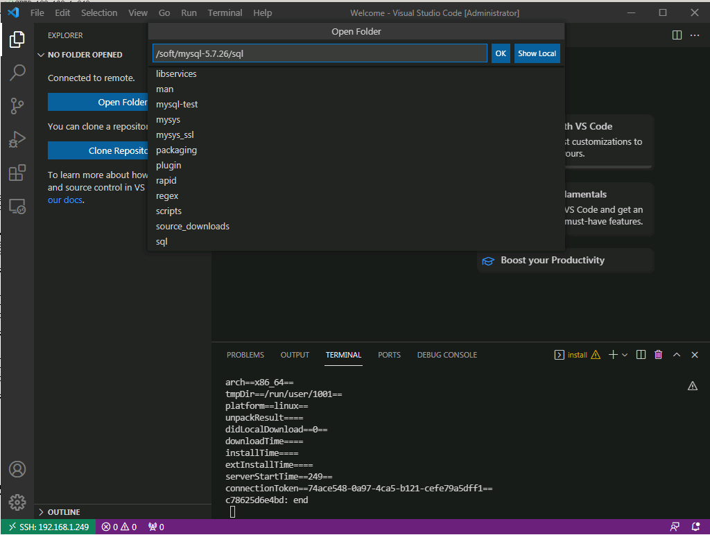 然后就可以从侧边栏打开项目路径了, 点击左边的资源管理器,点击打开文件夹,在下图蓝框处输入mysql源码路径(注意不是编译后的运行程序路径是源码解压路径,我的环境源码路径为/soft/mysql-5.7.26,这里我还向下选择sql目录,因为mysql的大多数核心代码在该目录下,如main函数)