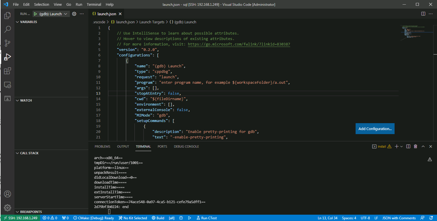 远程 Linux 机器 IP 是 192.168.1.249 gdbserver 的端口设为 2333, 在 VSCode 机器上, 进入菜单 调试 -> 添加配置, 会生成一个配置文件 SSH之后的项目根目录/.vscode/launch.json, 将其修改如下: