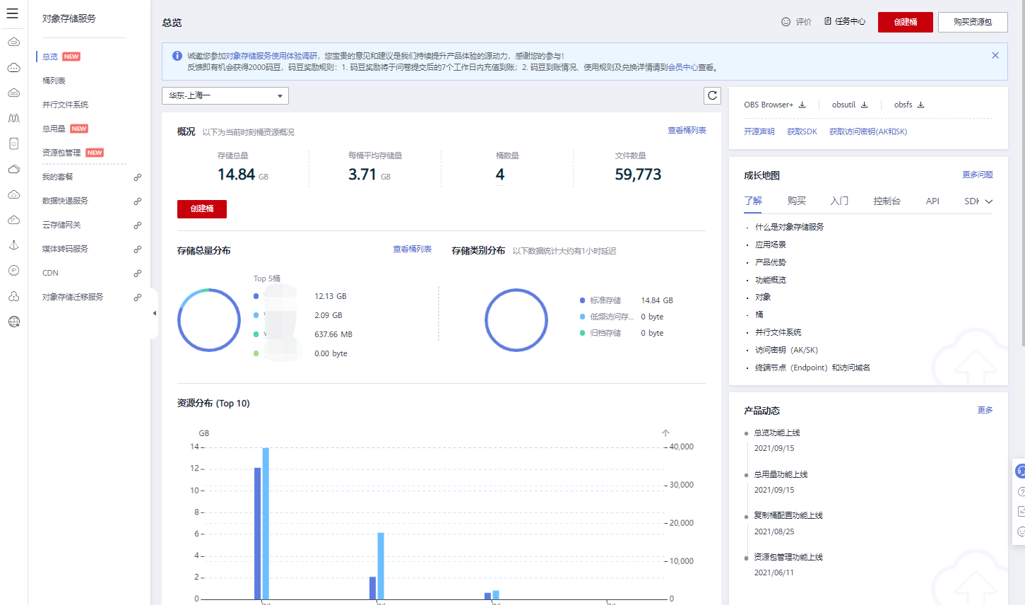 进入OBS控制台,我们可以看到总览情况,对于桶的数量、存储总量、文件数量以及资源分布情况都能有个清晰的预览。