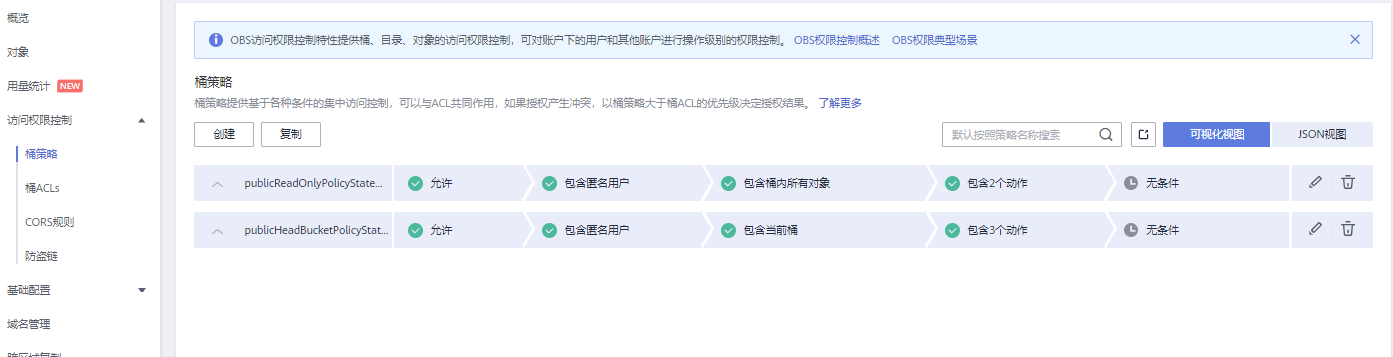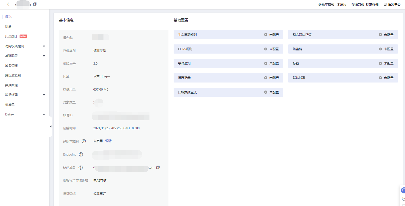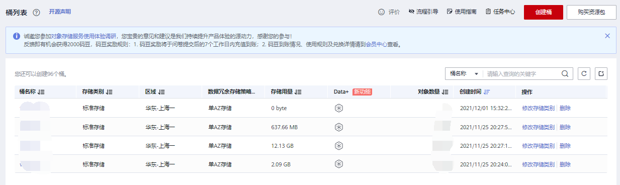 紧接着进入OBS桶列表可以看到我们创建的每个桶的详细信息: