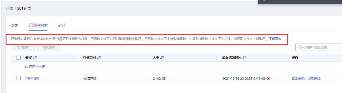 当开启多版本后,删除的对象会在已删除对象中显示,但是当去已删除对象中查看时,会发现如下神奇的展示: