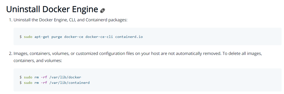 sudo apt-get purge docker-ce docker-ce-cli containerd.io