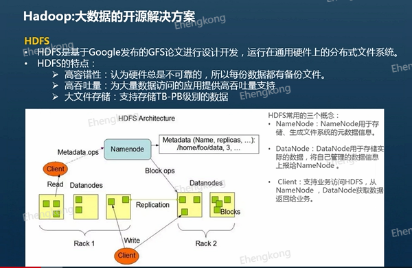首先是HDFS,HDFS是基于google发布的google File System论文进行设计开发,运行在通用软件上的分布式文件系统,简单来说就是将很多普通配置的机器结合起来,形成一个完整的文件系统。例如我们有一百台机器,每台机器只有1TB的存储空间,这时候HDFS可以将这一百台机器联合起来,管理所有机器的存储空间,从而形成一个100TB的文件系统。