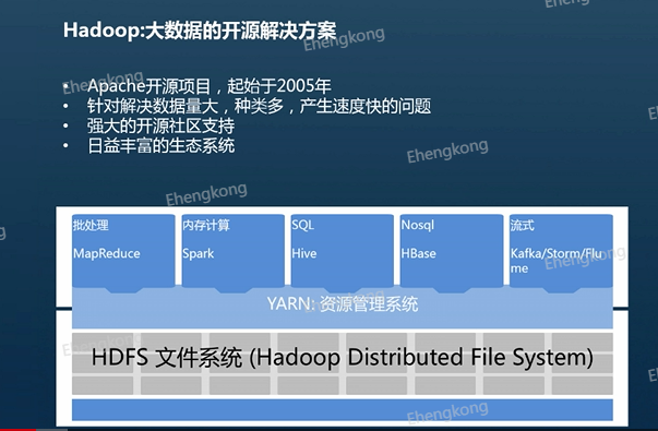 目前Apache的多个体系是业界通用的大数据解决方案,它受到google的MapReduce和google File System 的启发,在2005年被纳入Apache。而且在开源项目当中,基于它的分布式计算框架和分布式文件系统,能够很好地解决数据量大、种类多、产生速度快的问题,所以在开源社区中反响非常热烈,越来越多的公司开始使用这个解决方案,并且发现将发现的问题反馈给开源社区。同时也有越来越多的开发者投入到开源社区的开发中,逐渐完善整个系统,形成了一个良性循环。并且在Hadoop的基础上也衍生了其他的技术来解决各种各样的大数据问题,例如非关系型数据库HBase、数据仓库hive等。接下来我们来逐一介绍一下常用的大数据组件。