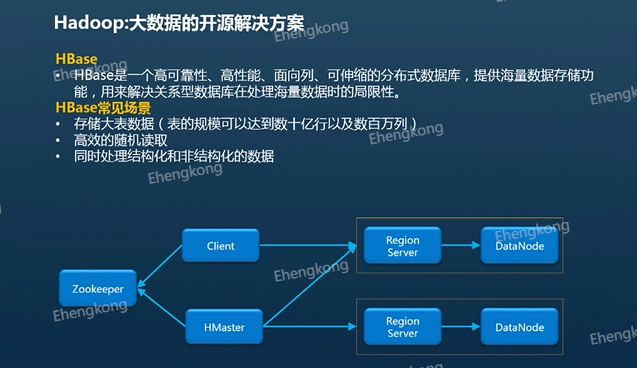 接下来我们介绍一下HBase的协作组件,HDFS和zookeeper。Zookeeper是作为HBase的文件存储,HBase 的数据全部存储在HDFS当中,并且Regionserver一般与HDFS的datanode部署到一起。而Zookeeper为HBase提供分布式的协作服务。所有的Regionserver会将自己的信息注册到Zookeeper中,HMater可以根据Zookeeper的信息感知到各个Regionserver的健康状态。
