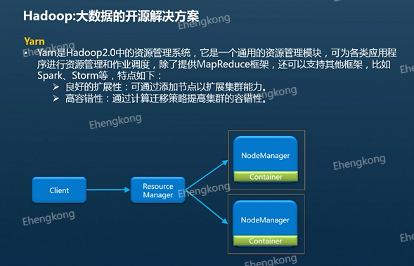 这边我们就要说到Yarn,Yarn是Hadoop 2.0的资源管理系统主要管理机器的内存和cpu等计算资源,并且对应用程序提供作业调度服务。除了提供MapReduce框架以外,还可以支持spark自动等框架。它具有良好的拓展性,可以通过添加节点以扩展集群能力。它也有高容错性,可以通过计算迁移策略来提高集群的容错性。当他检测到一台机器的任务失败后,他会将这两个任务分配给其他机器继续执行,以此来保证最终任务的完成。接下来我们来了解样的核心理念。resourcemanager、Node manager和container。