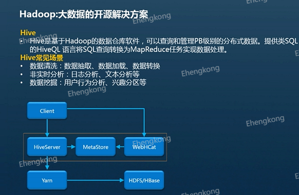 接下来介绍以Hadoop为基础衍生的大数据技术。很多数据分析师不一定会写程序,但是他们是数据库的专家,精通各种sql语句,于是就有了Hive,Hive是基于哈杜普的数据仓库软件,可以查询和管理pb级别的分布式数据,可以将SQL查询查转换为MapReduce任务实现数据的处理。Hive经常用在于数据清洗、非实时分析和数据挖掘等场景。
