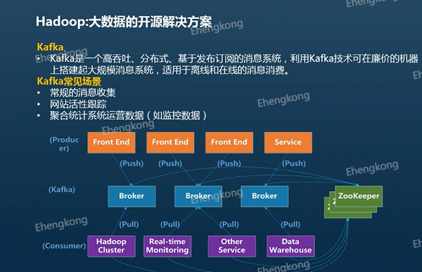 之前介绍的组件多数适用于离线数据的处理,接下来我们介绍适合实时数据处理的组件。首先是kafka,kafka是一个高吞吐、分布式、基于发布订阅的消息系统,利用kafka技术可以在廉价的机器上搭建起大规模消息系统,适用于离线和在线的消息消费。实时数据就像水流一样源源不断,而kafka就像一个蓄水池,有入水口和出水口,入水口的程序我们称为生产者,出水口的程序我们称为消费者,而生产者往这个水池里生产数据,消费者就在这个水池里对数据进行消费处理,所以kafka常用于常规的消息收集、网站的活性跟踪和聚合统计系统的运营数据等。