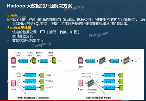 Spark是一种通用的高性能集群计算系统,既有类似于MapReduce的分布式内存计算框架,也有类似于hive的类SQL查询,还提供了实时数据的处理引擎和机器学习的算法库,所以它覆盖的使用场景比较多,比如快速的数据清洗、实时数据分析、数据挖掘和机器学习等。相比于MapReduce来讲,它的核心特点就是使用内存进行计算。MapReduce会将计算之后中间结果存放到HDFS当中,然后再从HDFS读取这些数据进行再计算。而Spark会将中间结果存放到内存里面,直接在内存里面进行迭代计算,大大提高了计算的效率。
