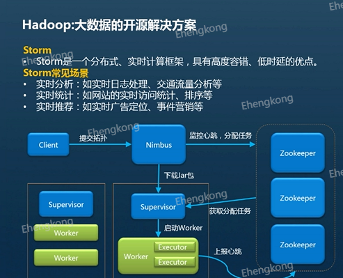 刚才提到消费者程序,那我们就来说一下Storm,Storm是一个分布式实时计算框架,具有高度容错、低时延的优点,所谓Storm常用于实时分析、实时统计和实时推荐等场景。我们从Storm的工作流中介绍Storm各个角色的功能。首先,client客户端向Nimbus提交具体的分析任务和Nimbus负责接收客户端提交的任务,并且将任务分发给Supervisor,Supervisor负责监听并接收Nimbus分配的任务,根据需要启动和停止属于自己管理的Worker进程。Worker进程是运行具体处理组件逻辑的进程,每一个Worker是单独的一个jvm进程,其中Executor是Worker里面的线程,负责处理具体的业务逻辑。而Zookeeper为服务提供分布式的协作。